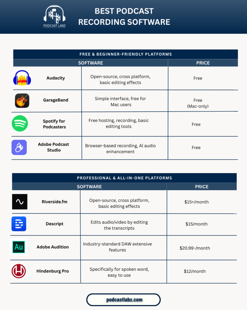 - Editing Needs: If you want advanced editing, use Audacity or GarageBand. For quick edits and publishing, Anchor or Riverside’s built-in tools are enough.